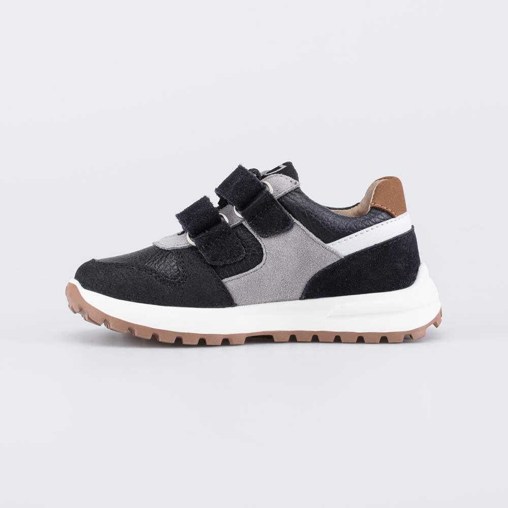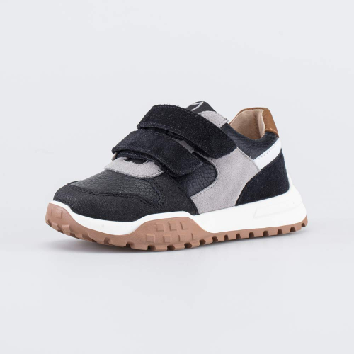 Серо-черные кроссовки с коричневым акцентом созданы с учетом возрастных особенностей стопы и подходят для мальчика дошкольного возраста.
