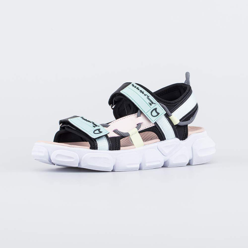 Сандалии на липучках, усиленных вставками из искусственной кожи, надежно фиксируются на ногах, их удобно обувать и снимать.