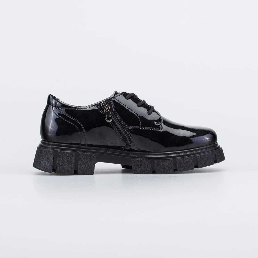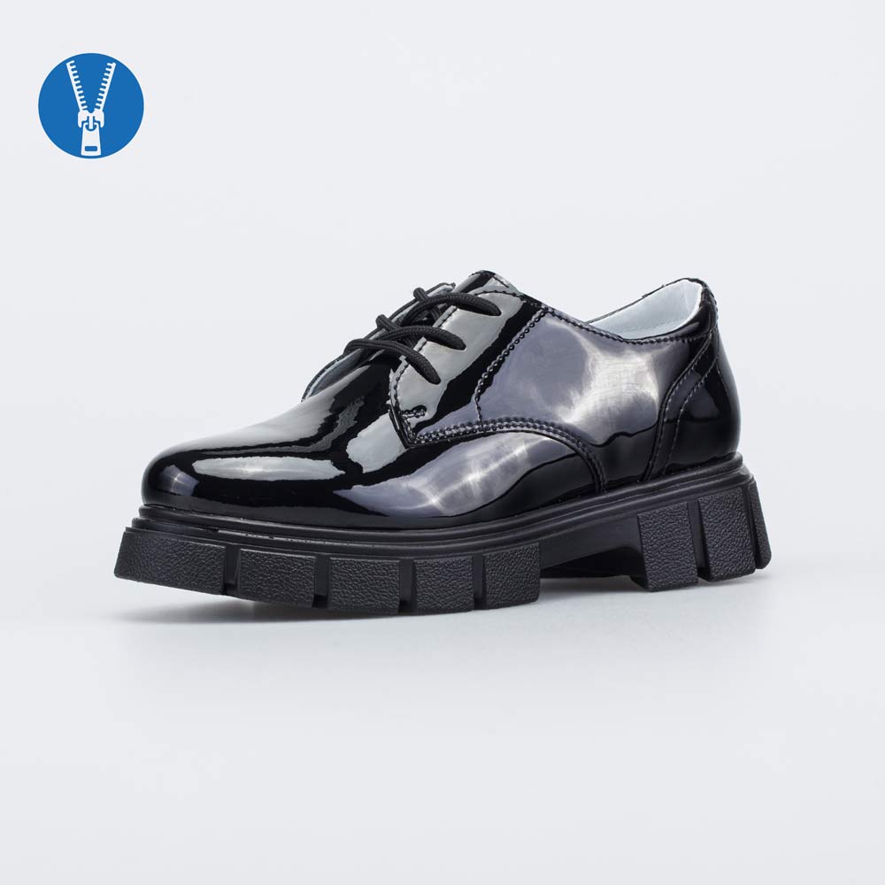 Полуботинки черного цвета из лаковой кожи подходят для девочки-школьницы.