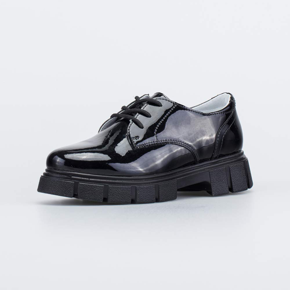 Верх черных полуботинок выполнен из гипоаллергенной и дышащей натуральной кожи с лаковым покрытием. Подкладка и стелька изготовлены из белой натуральной кожи – не придется переживать, что школьная обувь окрасит носочки или колготки.