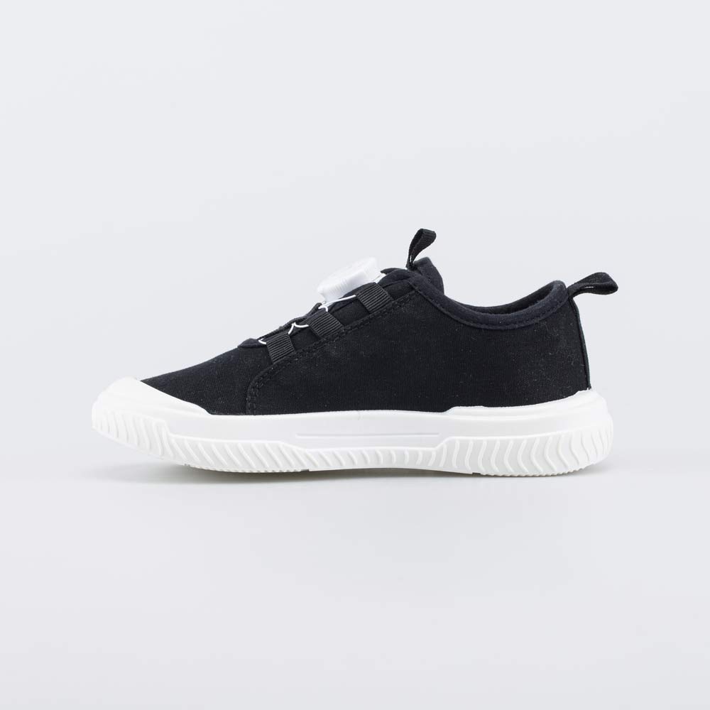 Текстильные кеды для девочки или мальчика выполнены в черном цвете и снабжены системой быстрой шнуровки, которая позволяет легко обуваться и разуваться. Достаточно покрутить гайку, и тросики зафиксируются, отрегулировав обувь по ноге.