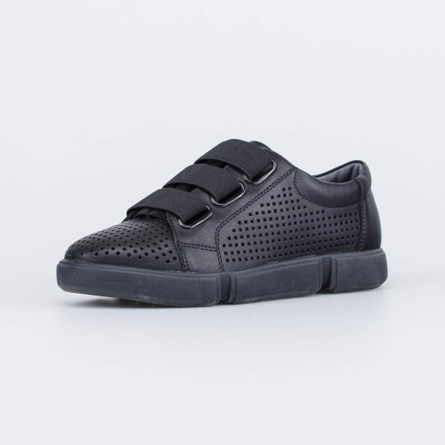Кожаные полуботинки-кеды черного цвета с перфорацией подходят для мальчика-подростка.