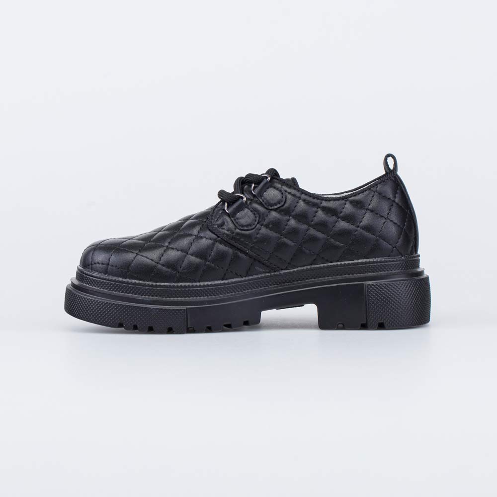 Туфли для девочки классического черного цвета с подкладкой из натуральной кожи. Верх выполнен из искусственной кожи, а подкладка и стелька из натуральной - износостойкого, гипоаллергенного и дышащего материала.