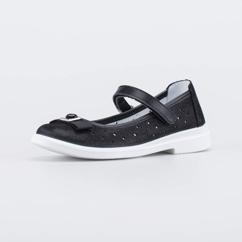Школьные туфли имеют верх из гипоаллергенной и дышащей натуральной кожи черного цвета. Сквозная перфорация увеличивает воздухопроницаемость и обеспечивает комфорт даже при длительной носке. Бантик придает строгой школьной обуви кокетливый и романтичный внешний вид.