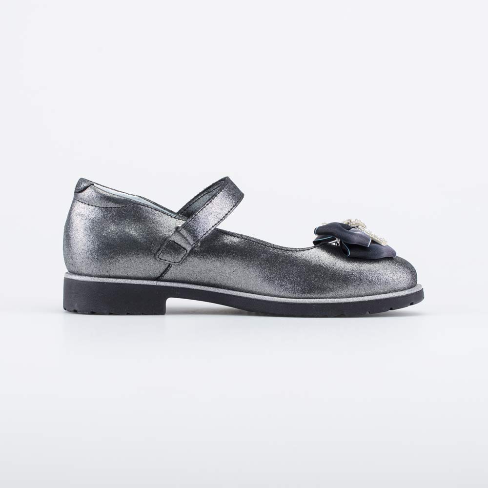 Праздничные туфли антрацитового цвета с блеском подходят для девочки-школьницы.