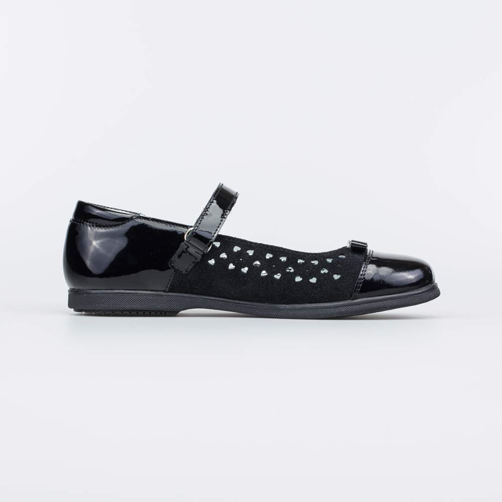 Верх изготовлен из сочетания натуральной лаковой кожи и натурального велюра. Украшен бантиком и фигурной перфорацией, которая обеспечивает вентиляцию и комфорт даже при длительной носке.