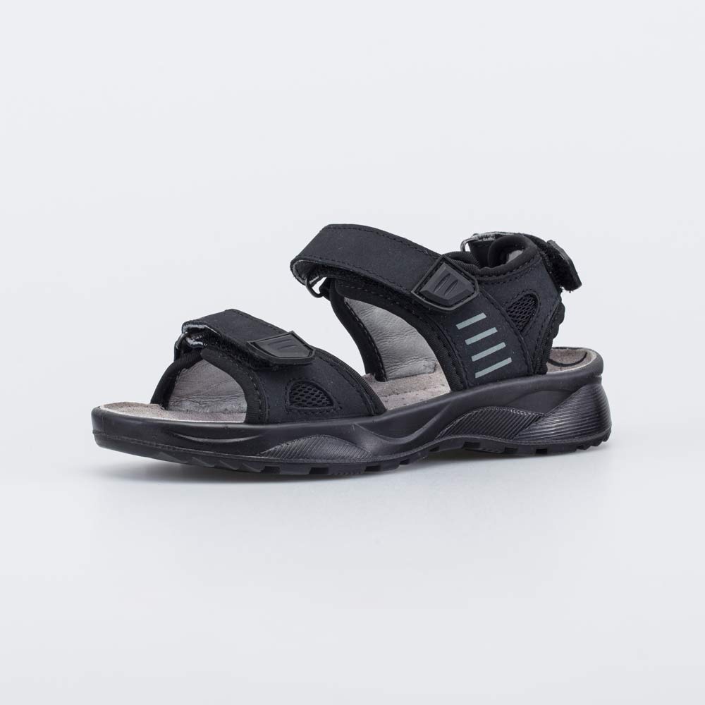 Летние сандалии имеют верх из натуральной кожи-нубука черного цвета, дополненной текстильными вставками. Подкладка и стелька из натуральной кожи обеспечивают высокие гигиенические свойства обуви.