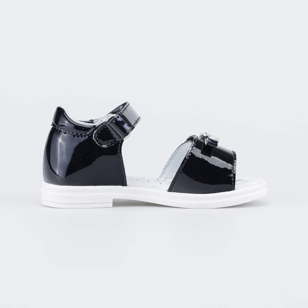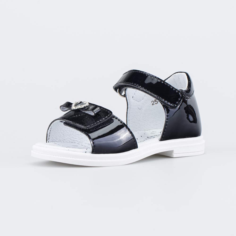 Лакированные босоножки выполнены в черном цвете, подходят для праздника, выпускного или семейной фотосессии.
