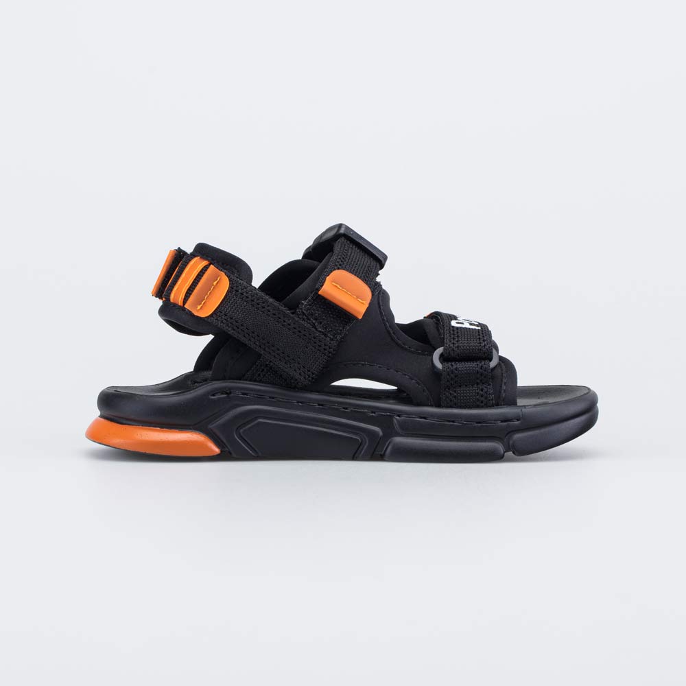 Сандалии выполнены в черном цвете и дополнены яркими оранжевыми акцентами.