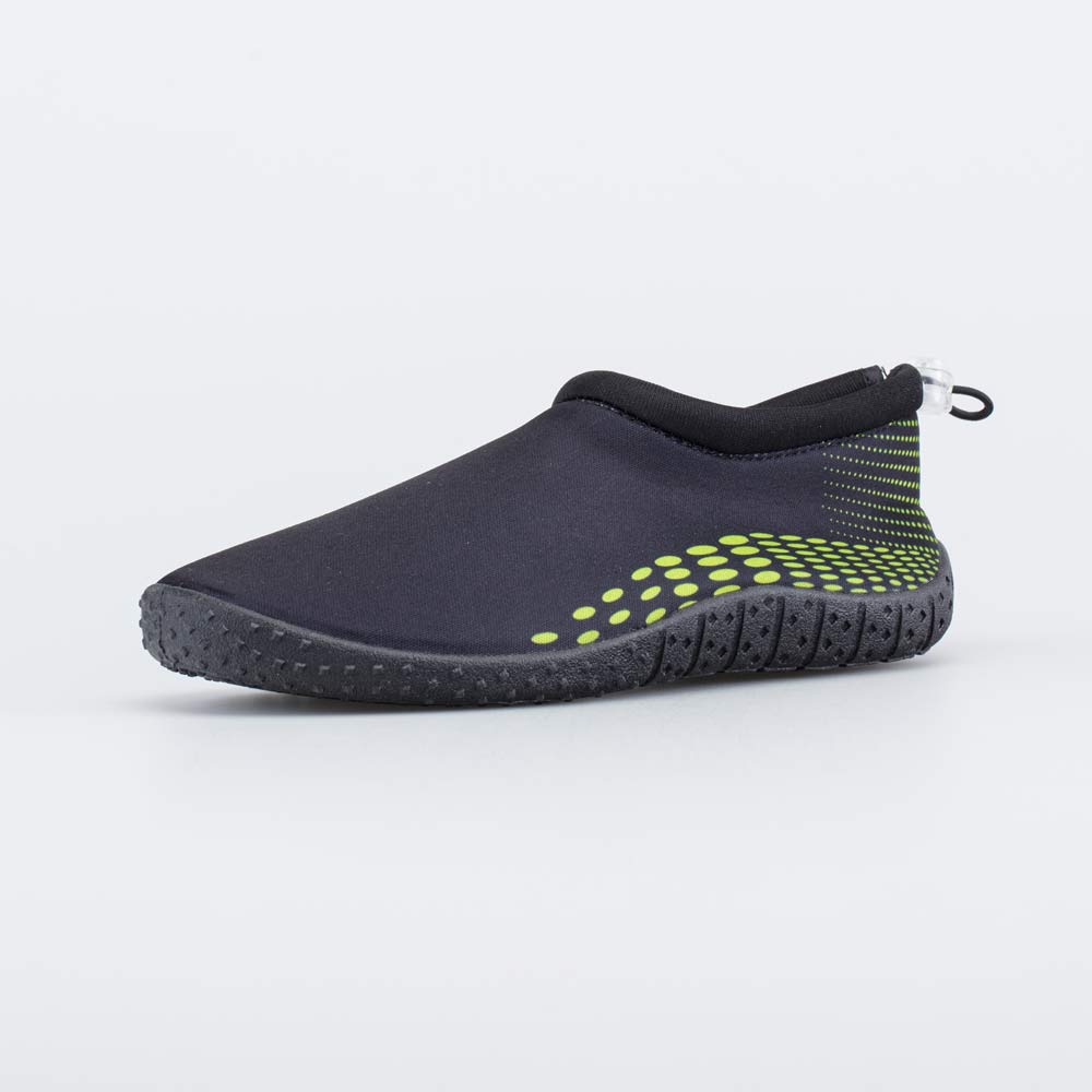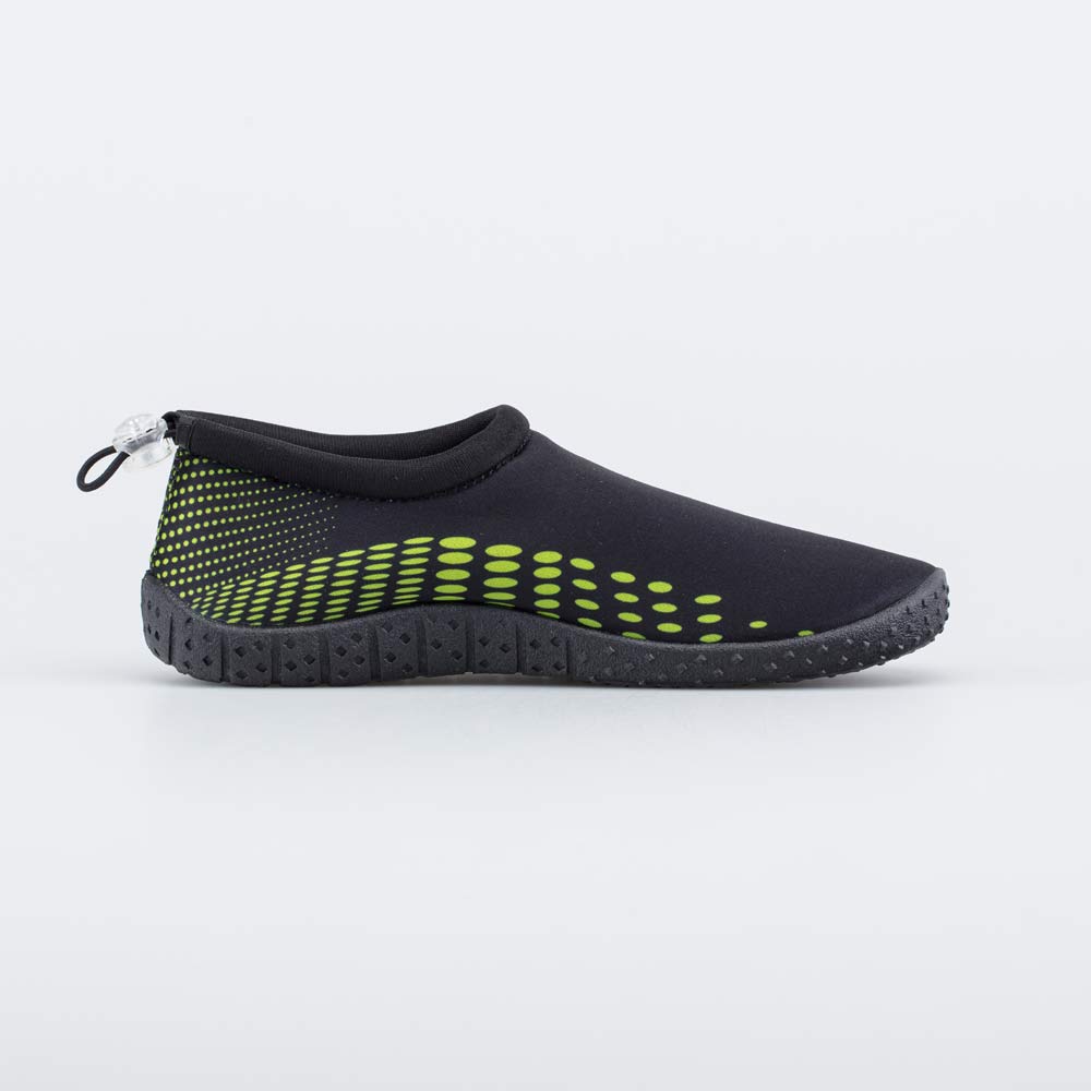 Пляжная обувь аквасоки выполнена в черном цвете с ярким салатовым акцентом, благодаря чему отлично сочетается с плавками и шортами.