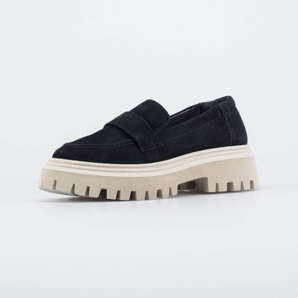 Черные кожаные лоферы на массивной тракторной подошве подходят для девочки-подростка.