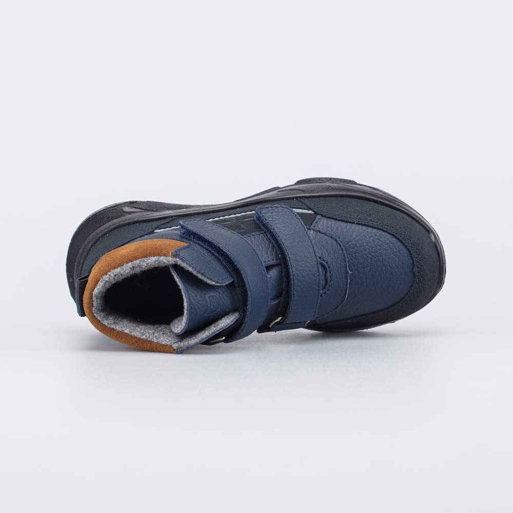 Демисезонные ботинки для мальчика выполнены с учетом возрастных особенностей стопы. Верх детских ботинок изготовлен из натуральной кожи синего цвета. По всему периметру вдоль подошвы имеется дополнительная кожаная накладка с ПУ-напылением, предохраняющая от влаги и реагентов. Утепленные ботинки имеют подкладку из шерстяной байки и войлочную стельку, которые хорошо удерживают тепло и обеспечивают здоровый микроклимат вокруг ножек. Стелька снабжена шелковой петелькой, чтобы было удобно вынимать для проветривания. Ботинки на липучках, которые обеспечивают хорошую раскрываемость модели во время обувания и позволяют отрегулировать посадку обуви по ноге. Подошва изготовлена из легкого и амортизирующего полиуретана, что делает ботинки удобными для активных детей. Модель анатомически-правильная: имеет задник необходимой жесткости, приподнятость пяточной части и круглый носок.