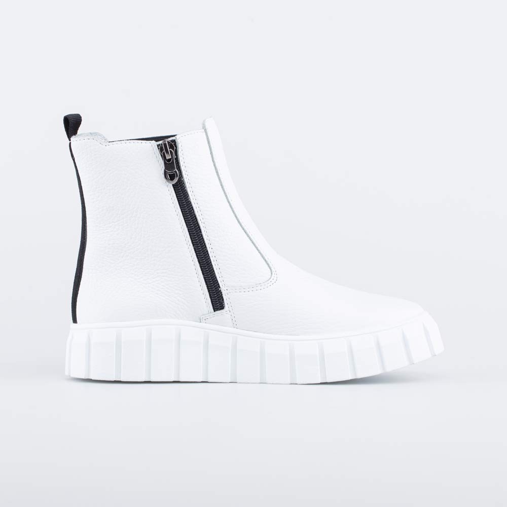 Демисезонные сапожки-челси для девочки-подростка выполнены в белом цвете с акцентом черного.