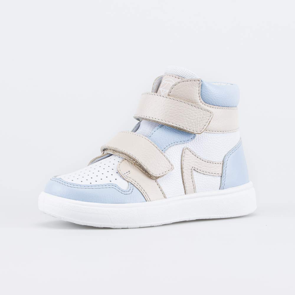 Демисезонные ботинки, созданные с учетом особенностей детской стопы, выкрашены в сочетании трендовых цветов (бежевого и голубого) и подходят для девочки, которая только начинает ходить.