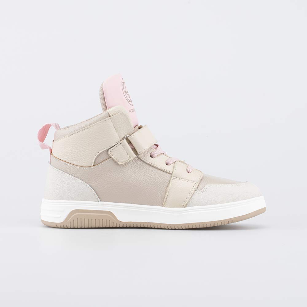 Высокие кеды для девочки, созданные с учетом возрастных особенностей стопы, выполнены в сочетании нежных оттенков бежевого и розового. Изюминку современности модели придает пухлый текстильный язычок с принтом.