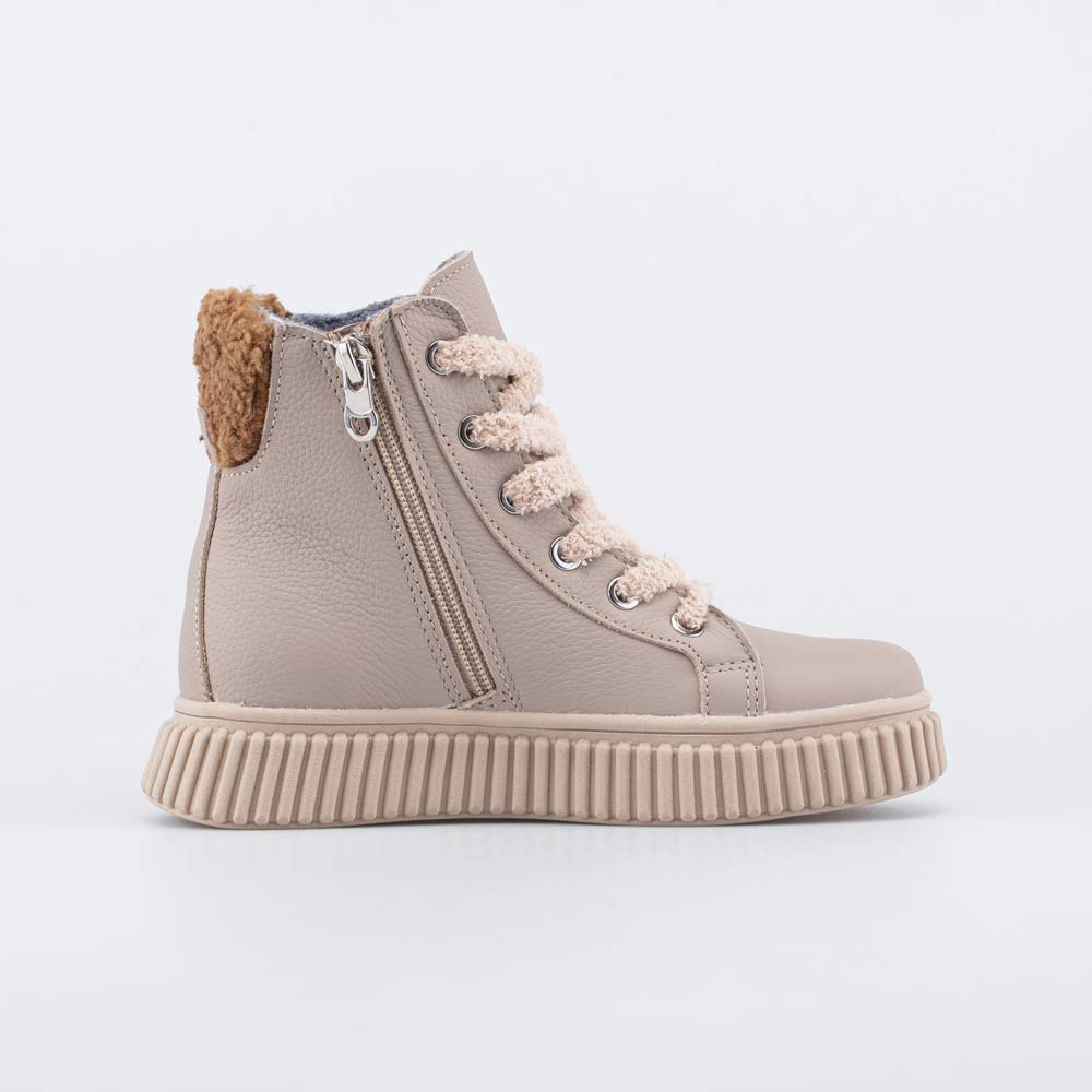 Верх этих бежевых ботинок изготовлен из гипоаллергенной и дышащей натуральной кожи разных фактур (гладкая кожа, велюр). Манжет украшен трендовым мехом под барашка. Тему тактильности продолжает махровая нашивка в виде медвежонка и махровые шнурки.