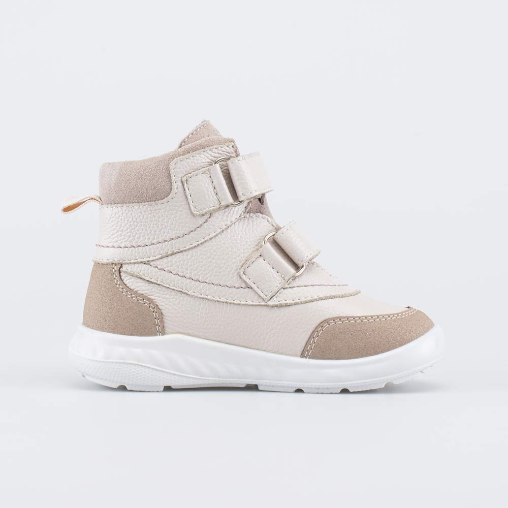 Верх детских ботинок изготовлен из гипоаллергенной и дышащей натуральной кожи бежевого цвета. Носочная и пяточная части ботинок защищены антивандальными накладками.