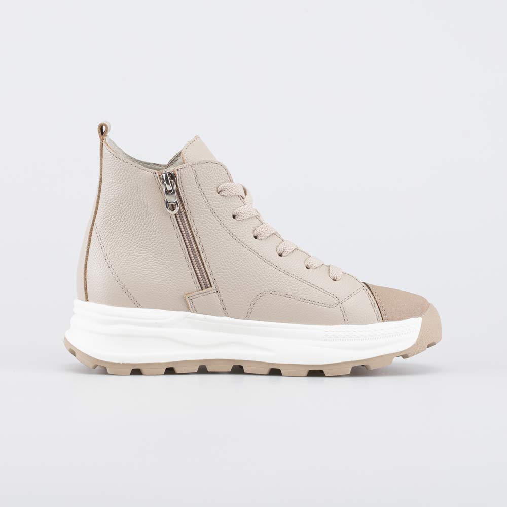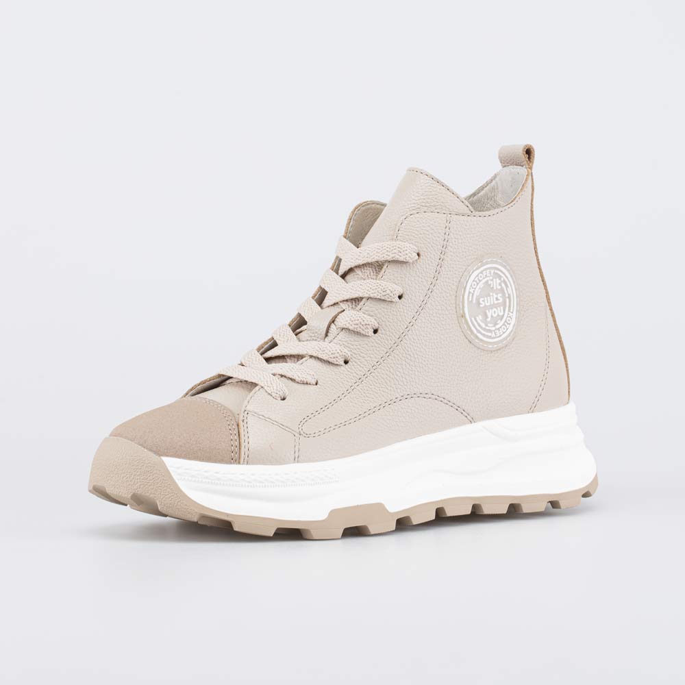 Ботинки на высокой подошве выполнены в трендовом бежевом цвете и стилизованы под Retro-кеды. Декорированы нашивкой в виде печати с надписями и предназначены для девочки подросткового возраста.