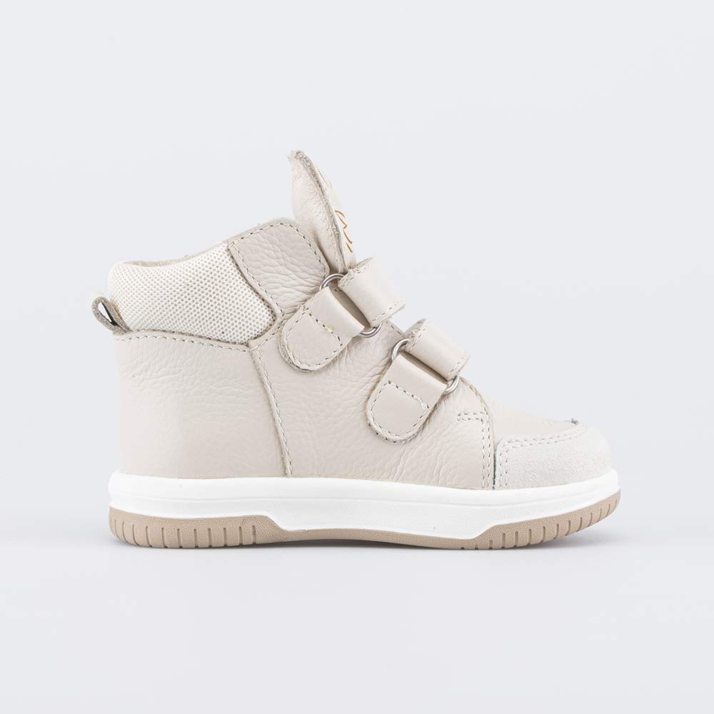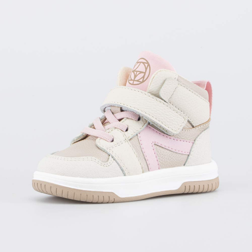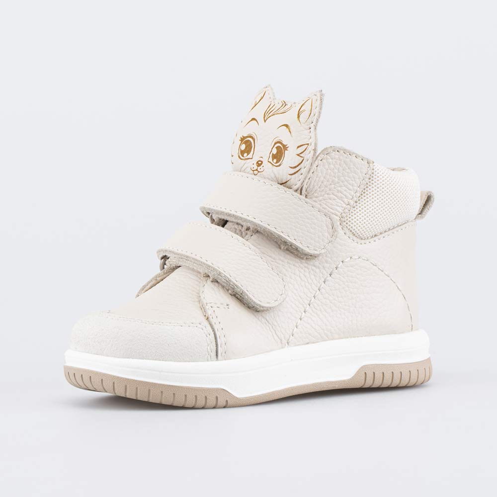 Высокие кеды, созданные с учетом особенностей детской стопы, выполнены в трендовом бежевом цвете и украшены принтом на язычке. Подходят для девочки, которая только начинает ходить.