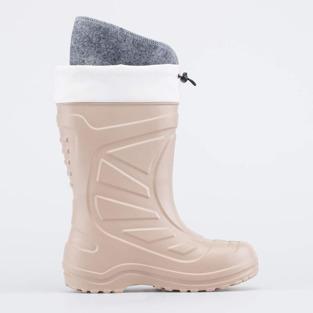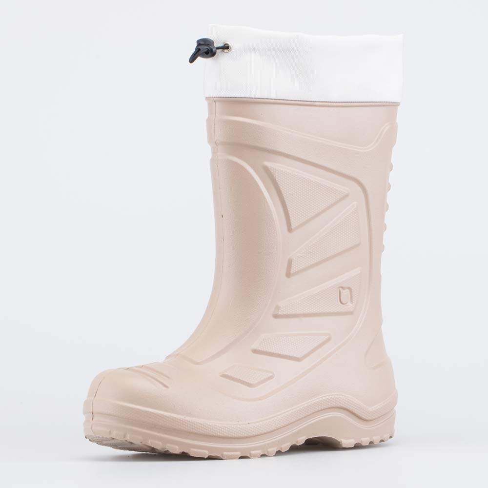 Утепленные сапожки из легкого, гибкого и амортизирующего материала ЭВА выполнены в трендовом бежевом цвете. Имеют вкладной чулок и манжету для защиты от влаги.