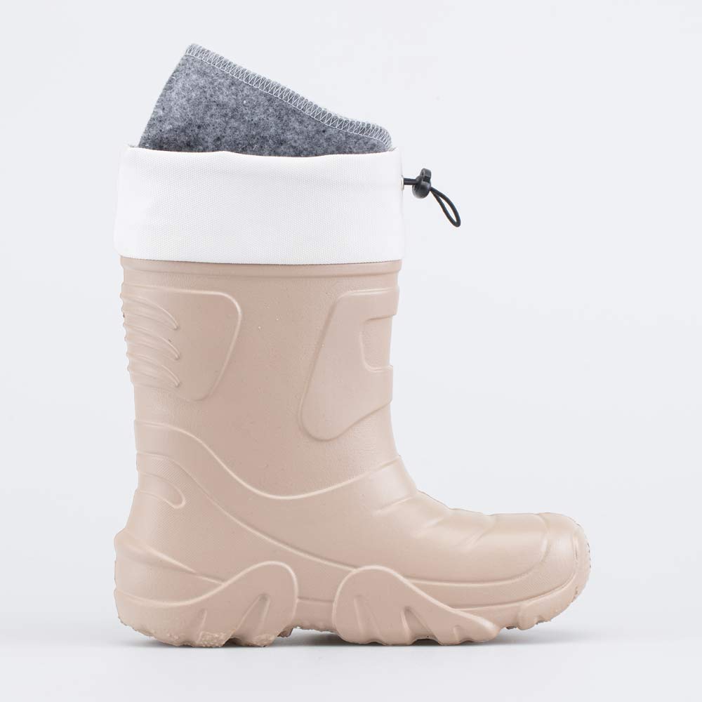 Утепленные сапожки из легкого, гибкого и амортизирующего материала ЭВА выполнены в трендовом бежевом цвете. Имеют двухслойный вкладной чулок и учитывают особенности детской стопы.