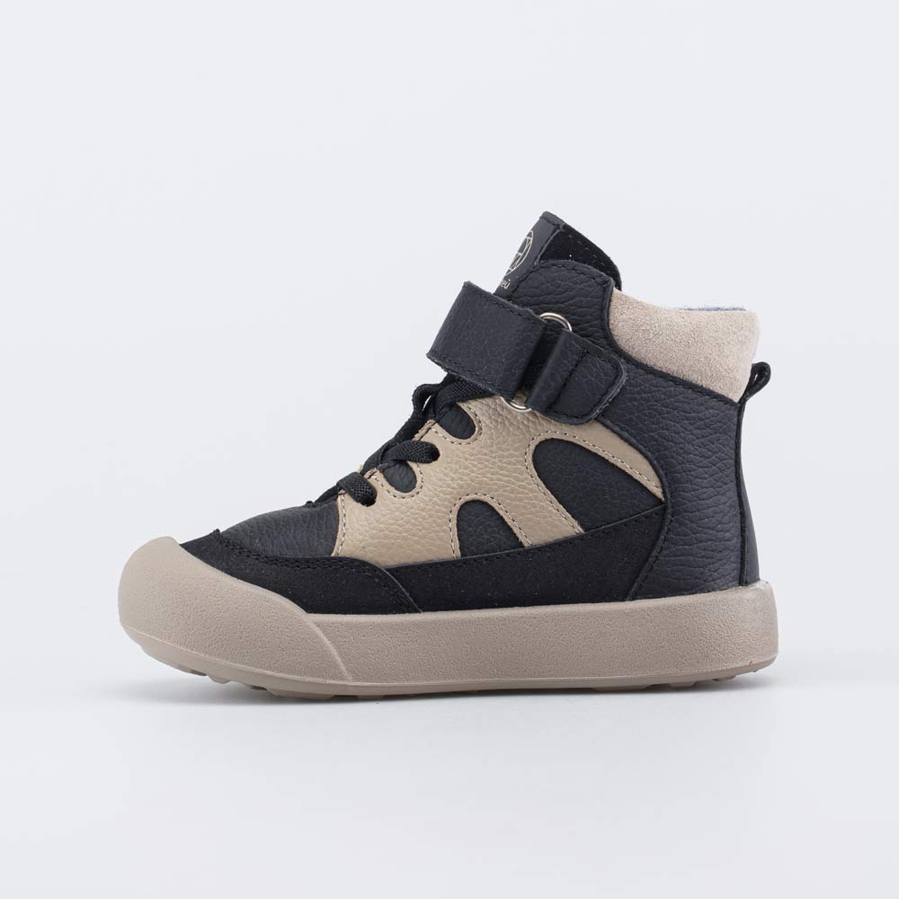 Верх детских ботинок изготовлен из гипоаллергенной и дышащей натуральной кожи. В нижней части имеется антивандальная накладка. Дополнительную защиту обеспечивает наплыв подошвы на носок.