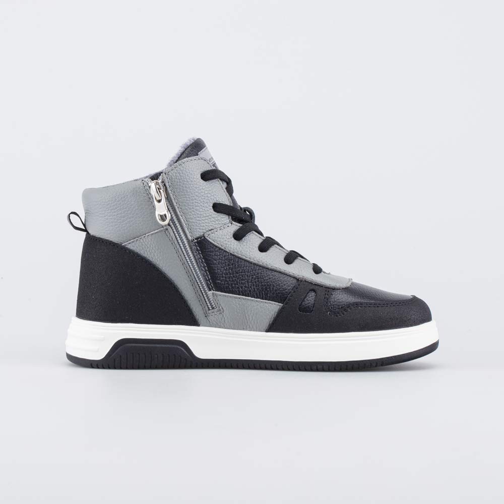 Утепленные ботинки, стилизованные под кожаные кеды, подходят для холодной осенней и весенней погоды. Гармоничное сочетание черного и серого цветов придает модели изюминку, при этом сохраняя универсальный характер расцветки.