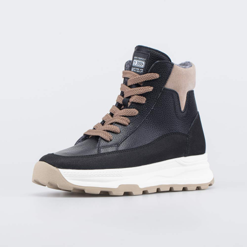 Утепленные ботинки, стилизованные под кожаные кеды, подходят для холодной осенней и весенней погоды. Гармоничное сочетание черного и серого цветов придает модели изюминку, при этом сохраняя универсальный характер расцветки.