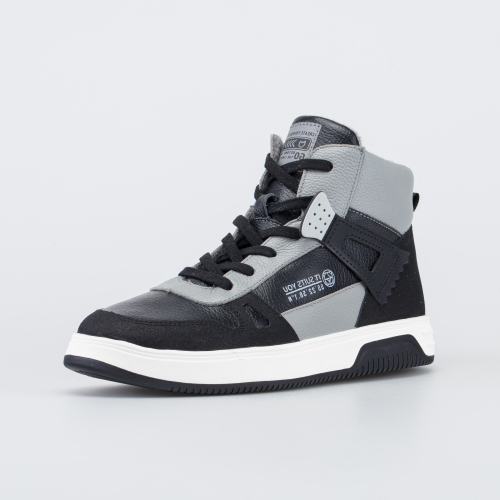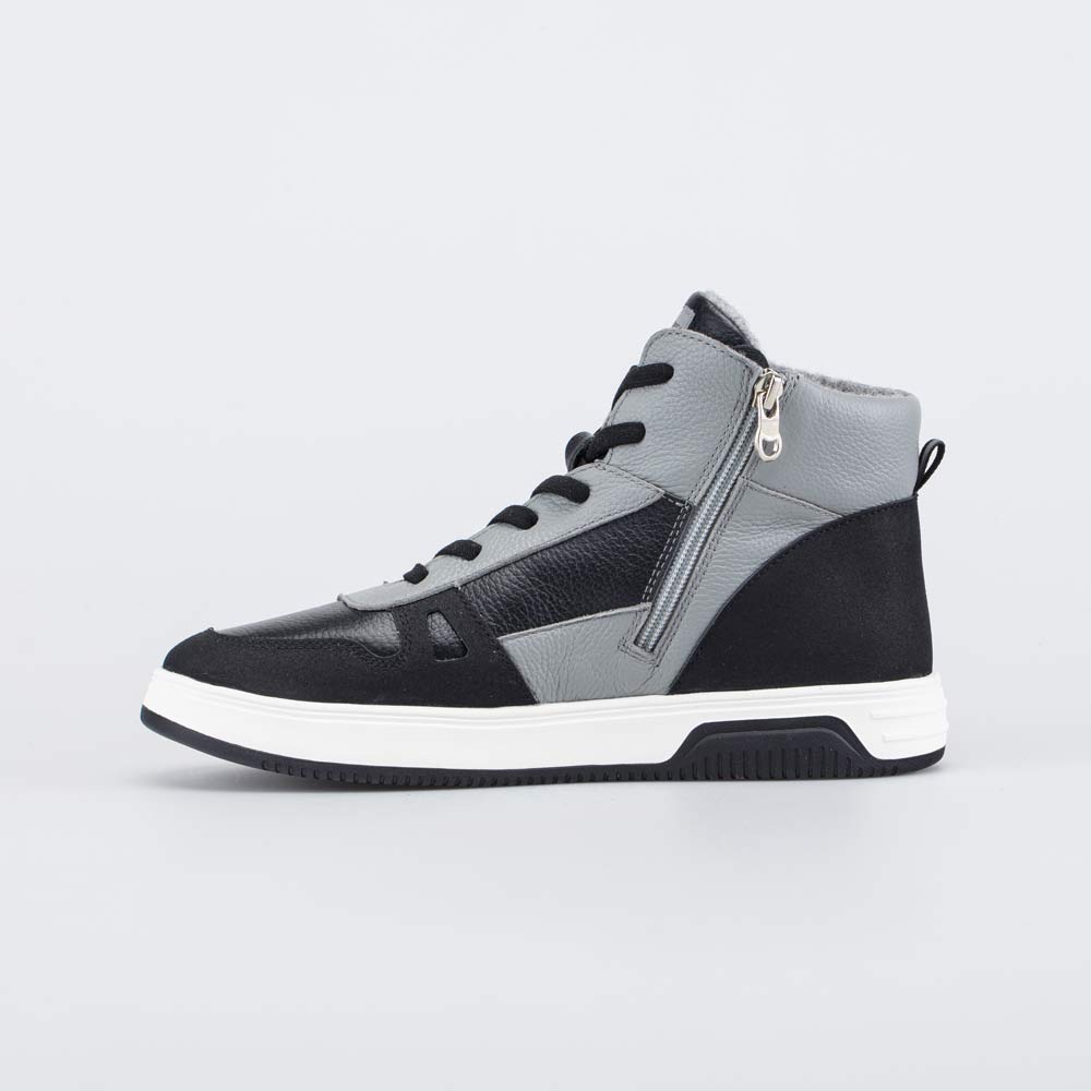 Утепленные ботинки, стилизованные под кожаные кеды, подходят для холодной осенней и весенней погоды. Гармоничное сочетание черного и серого цветов придает модели изюминку, при этом сохраняя универсальный характер расцветки.