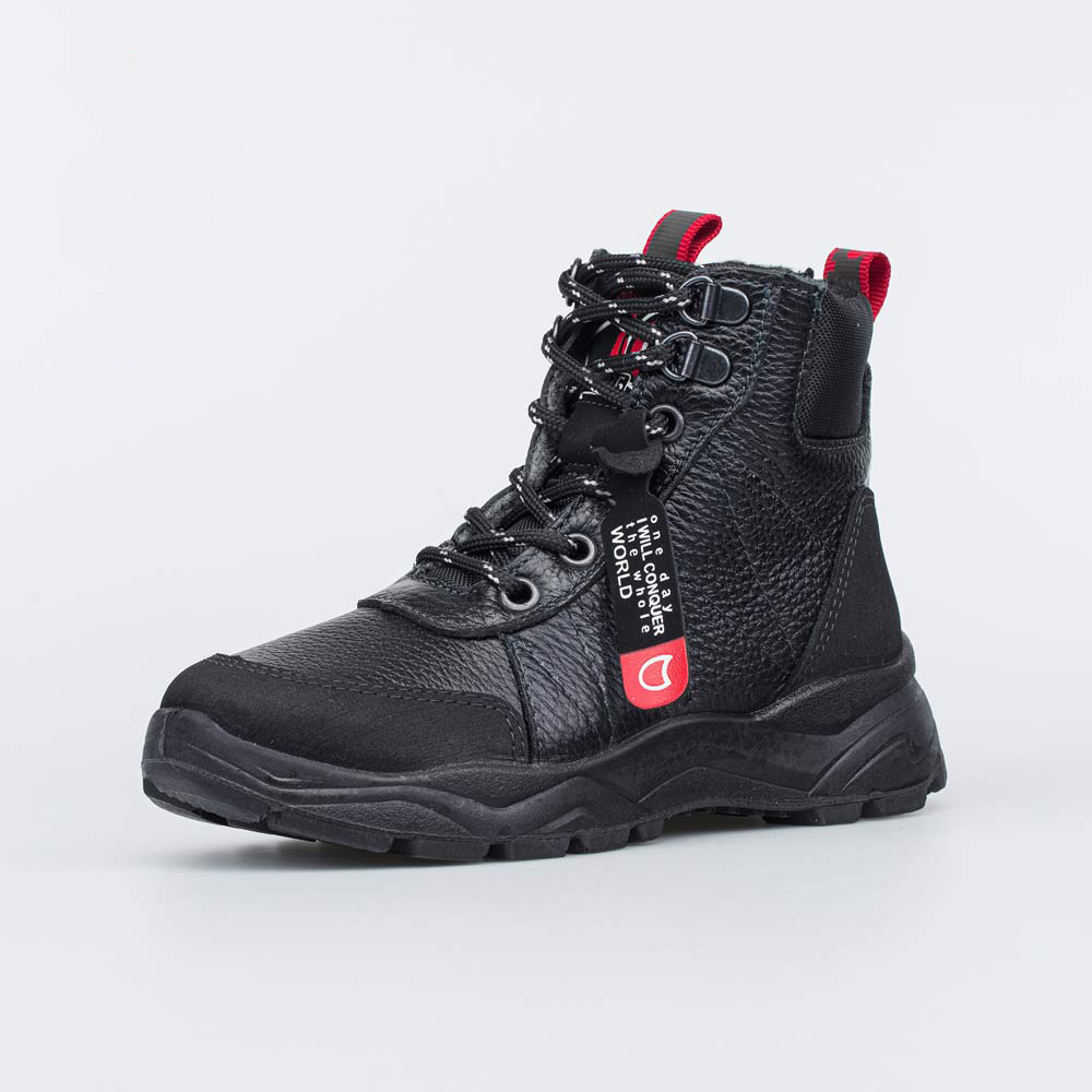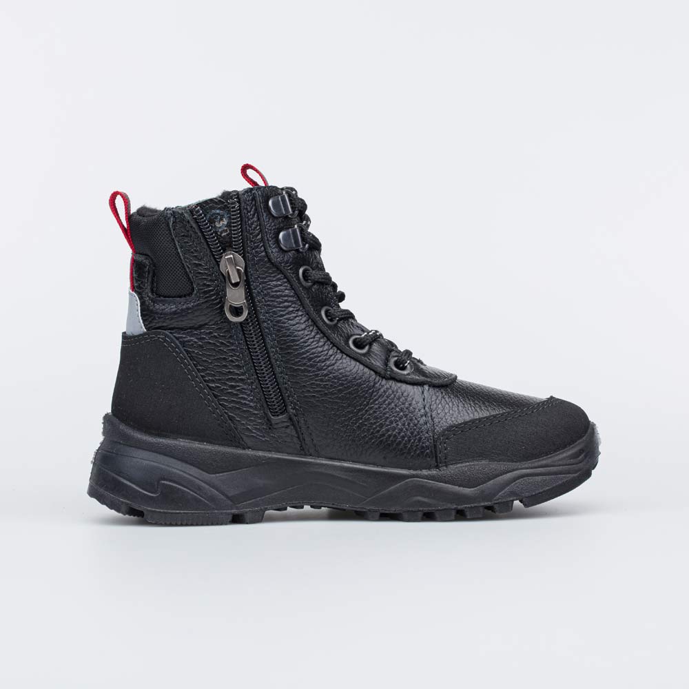 Высокие ботинки в спортивном стиле предназначены для носки в холодную осеннюю и весеннюю погоду. Верх этих черных ботинок изготовлен из гипоаллергенной и дышащей натуральной кожи. Носочная и пяточная части защищены от реагентов и повреждений антивандальными накладками с ПУ-напылением. Подкладка из шерстяной байки и войлочная стелька надежно сохраняют тепло, отводят от стоп влагу и обеспечивают здоровый микроклимат внутри детской обуви. Стелька имеет петельку, чтобы легко вынимать ее для проветривания. Детские ботинки на шнурках достаточно один раз отрегулировать по стопе, а в дальнейшем пользоваться молнией. Подошва из ПУ (полиуретана) хорошо амортизирует и сохраняет демисезонную обувь легкой. Модель имеет анатомически-правильную форму следа, а стелька из войлока приформовывается к стопе, принимая индивидуальную анатомическую форму. Сделано в России.