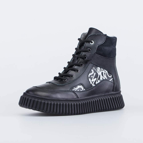 Верх этих черных ботинок изготовлен из гипоаллергенной и дышащей натуральной кожи. Носочная часть защищена от реагентов и повреждений антивандальной накладкой с ПУ-напылением. Светоотражающие детали повышают безопасность ребенка в темноте.