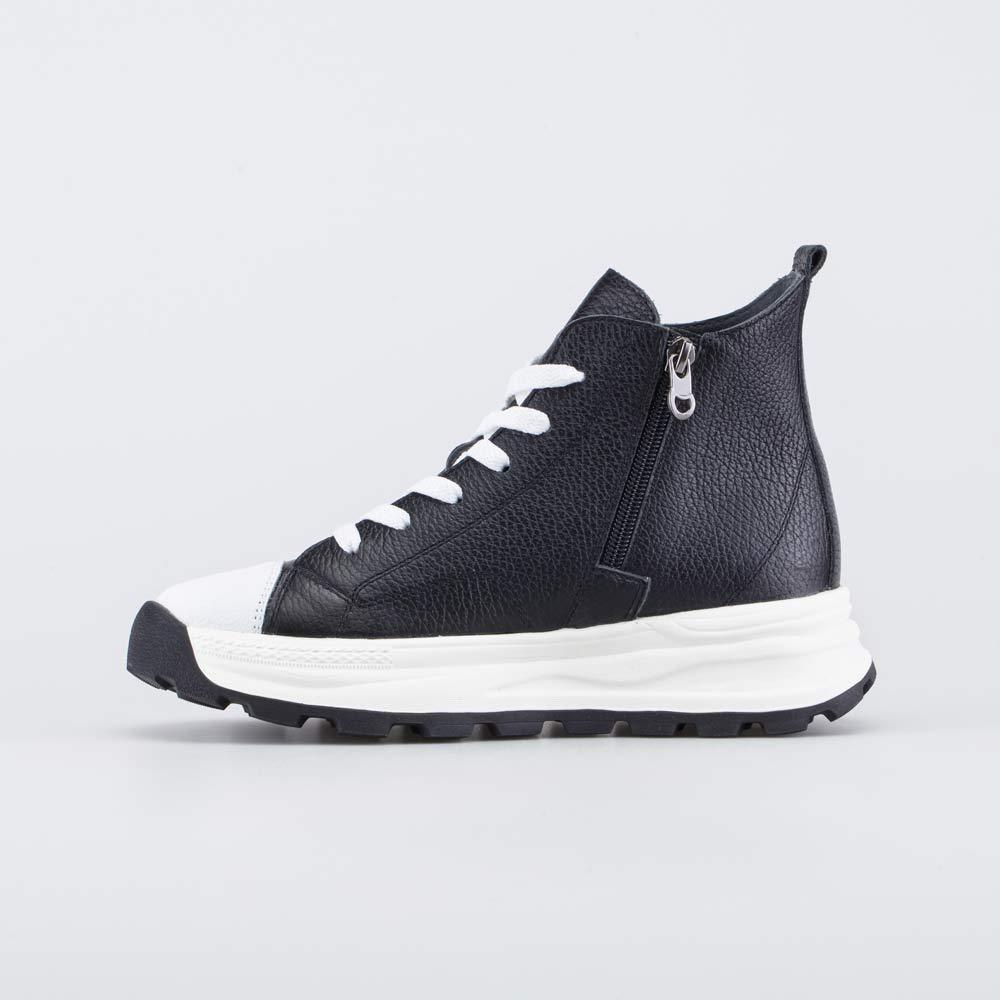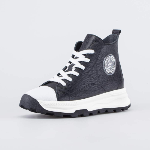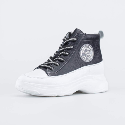 Ботинки на высокой подошве выполнены в сочетании контрастных цветов (черного и белого) и стилизованы под Retro-кеды. Декорированы нашивкой в виде печати с надписями и предназначены для девочки школьного возраста.