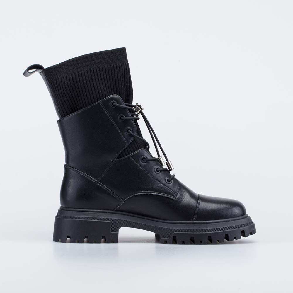 Низ (ботинок) выполнен из натуральной кожи классического черного цвета, которая эффектно дополняется текстильным чулком в рубчик.