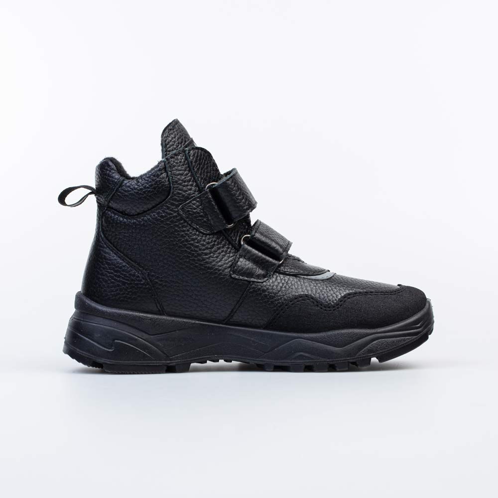 Верх этих черных ботинок изготовлен из гипоаллергенной и дышащей натуральной кожи. Носочная часть защищена от реагентов и повреждений антивандальной накладкой с ПУ-напылением. Светоотражающие детали повышают безопасность в темное время суток.