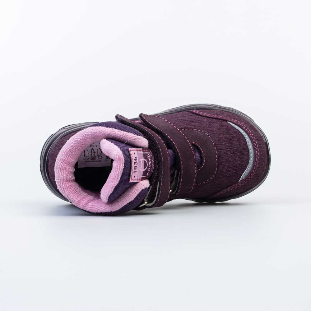 Фиолетовые ботинки на липучках имеют байковую подкладку и подходят для холодной погоды.