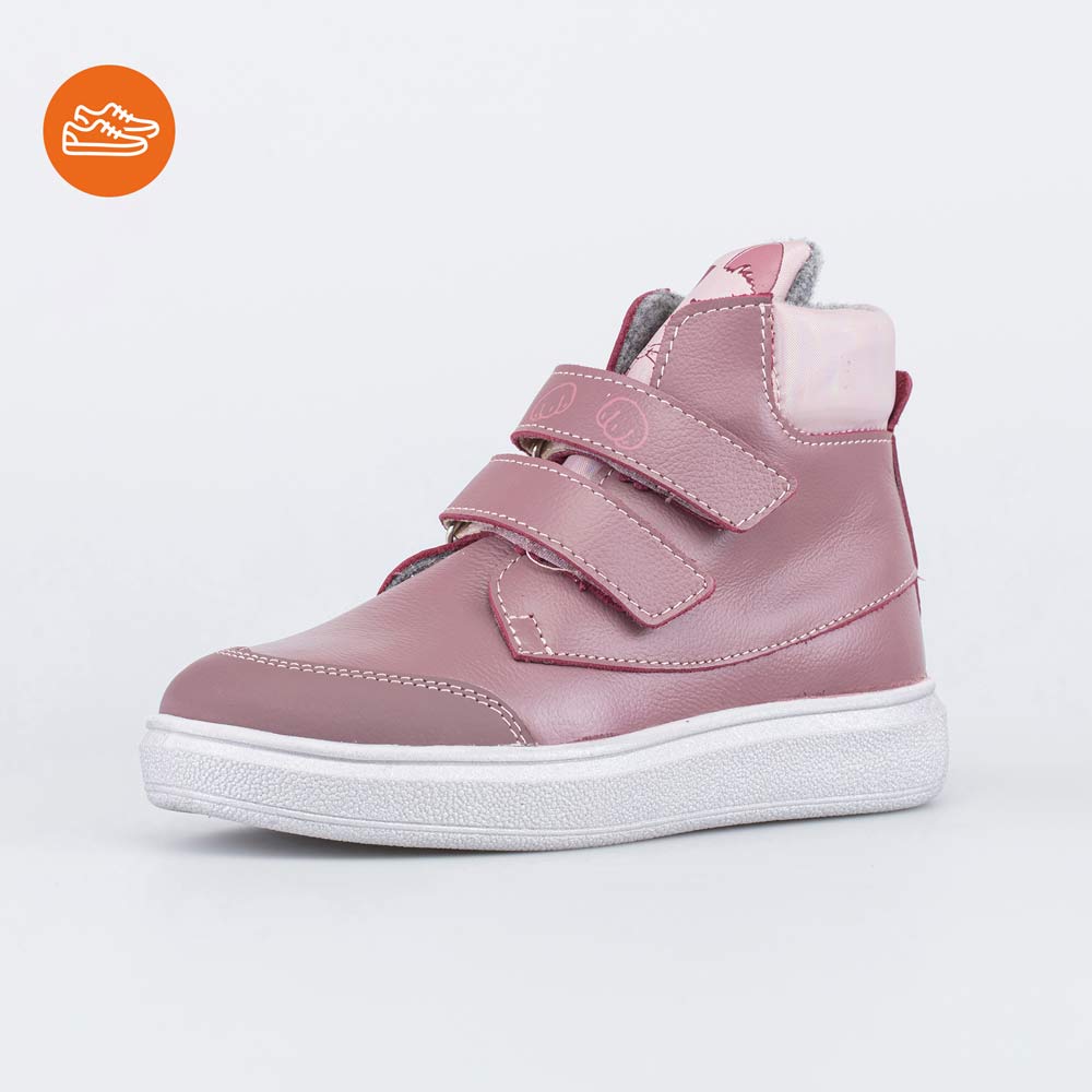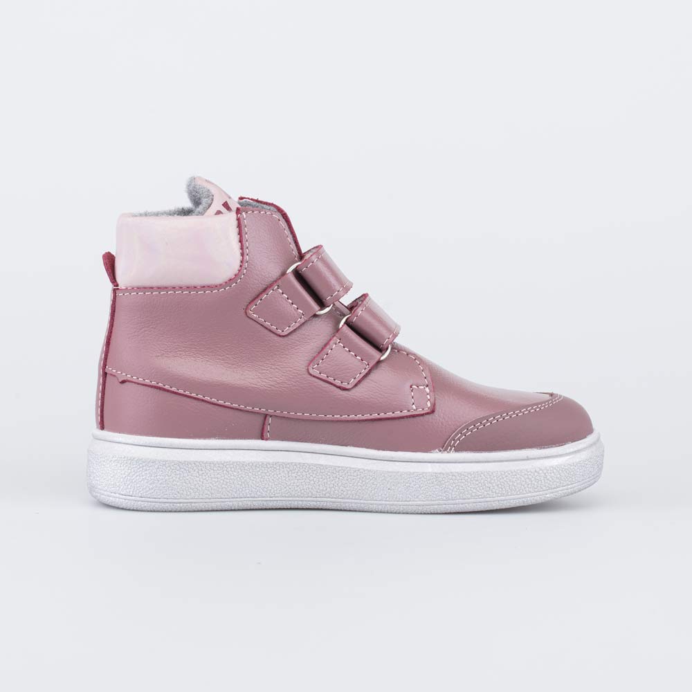 Верх выполнен из натуральной кожи темно-розового цвета. Подкладка из шерстяной байки и войлочная стелька удерживают тепло и обеспечивают здоровый микроклимат вокруг ножки. Войлочная стелька снабжена шелковой петелькой, чтобы было удобно вынимать для проветривания.
