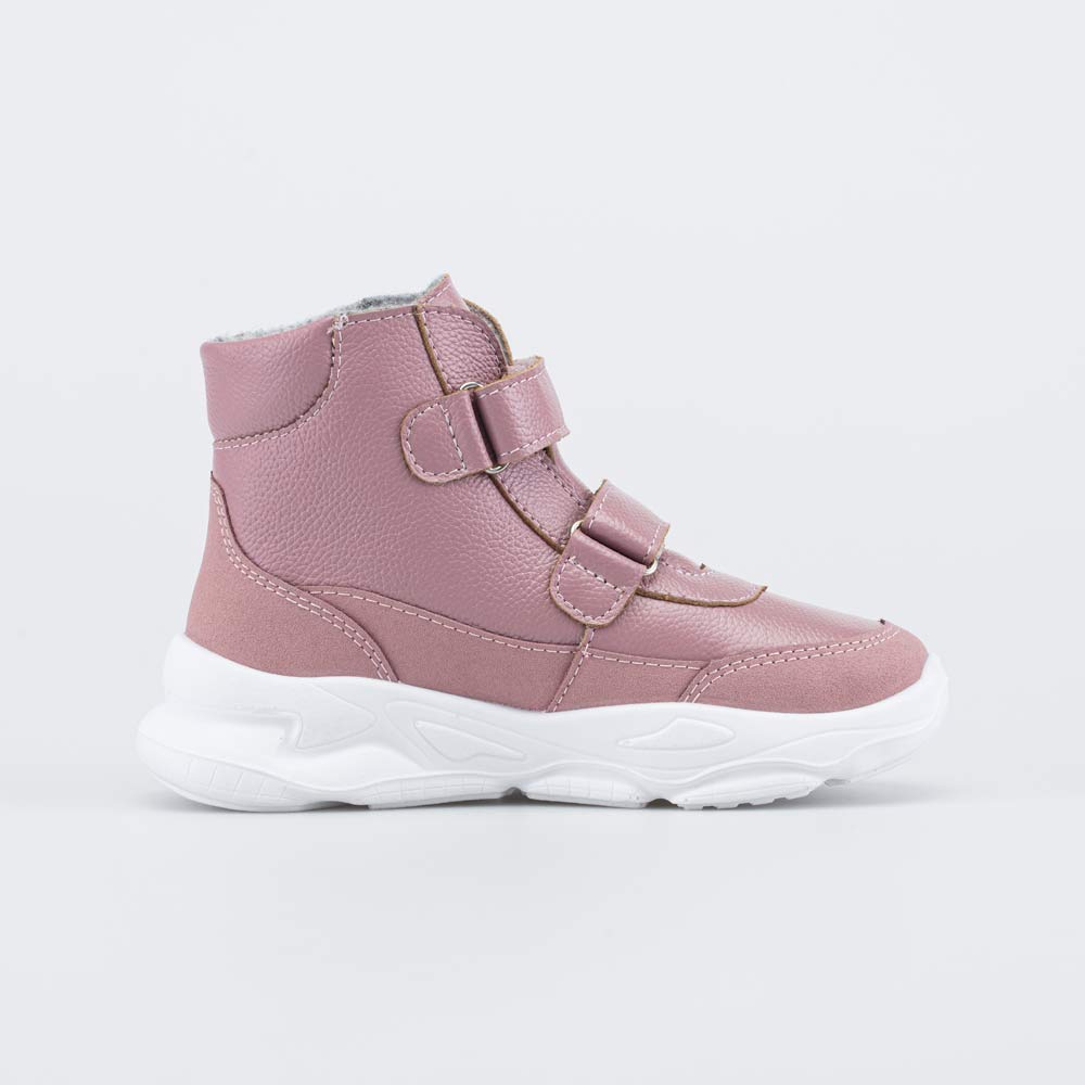 Верх розовых ботинок изготовлен из гипоаллергенной и дышащей натуральной кожи и украшен перламутровой нашивкой с надписью. По всему периметру вдоль подошвы имеется антивандальная накладка с ПУ-напылением.