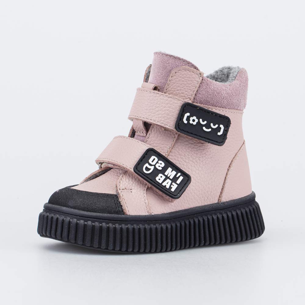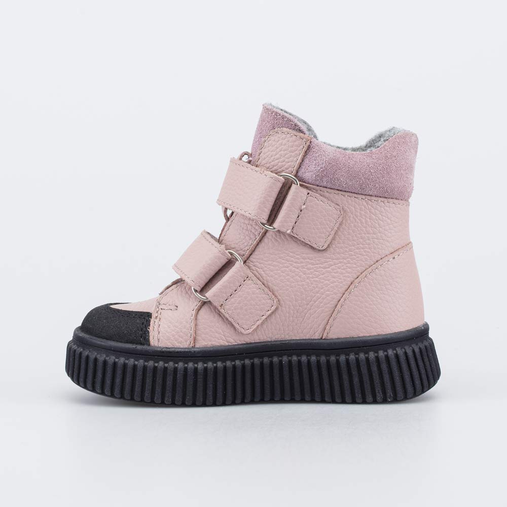 Верх выполнен из натуральной гладкой кожи розового цвета. Подкладка из байки (больше 80% натуральная овечья шерсть) и войлочная стелька хорошо сохраняют тепло.