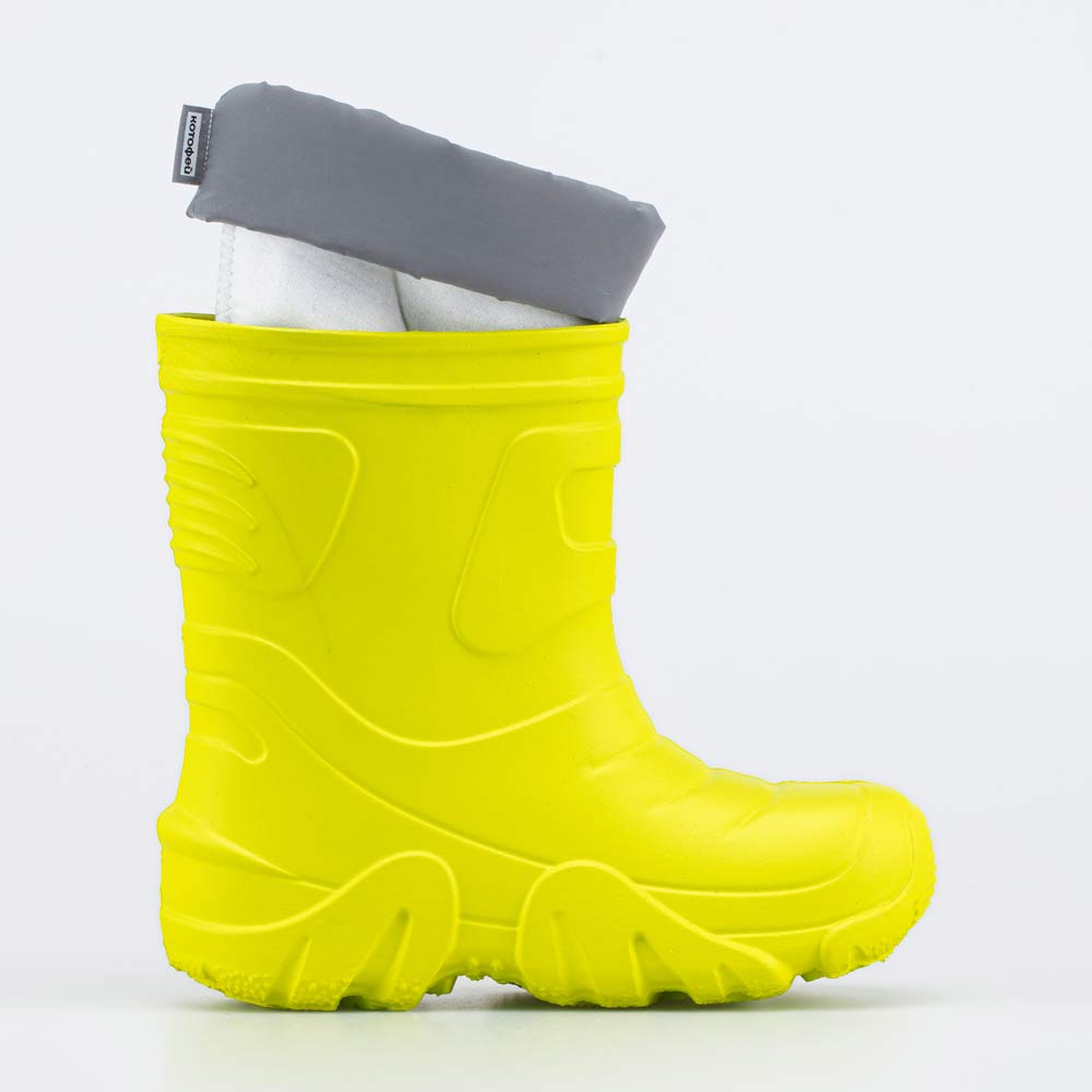 Утепленные детские сапожки из ЭВА выполнены в позитивном салатовом цвете и украшены принтом. Они отлично подходят для прогулок в дождливую погоду.