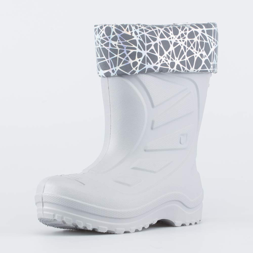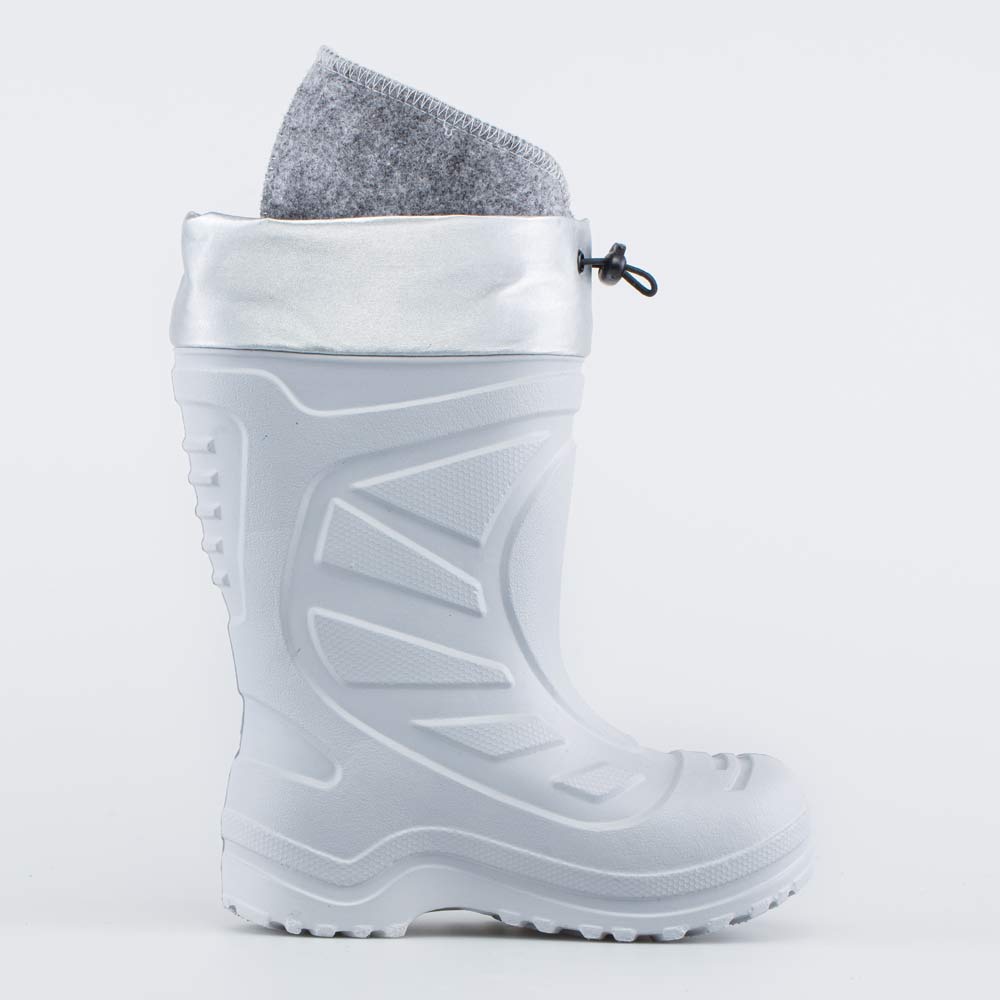 Детские утепленные сапожки из легкого, гибкого и амортизирующего материала ЭВА выполнены в трендовом сером цвете. Имеют вкладной чулок и манжету для защиты от влаги.