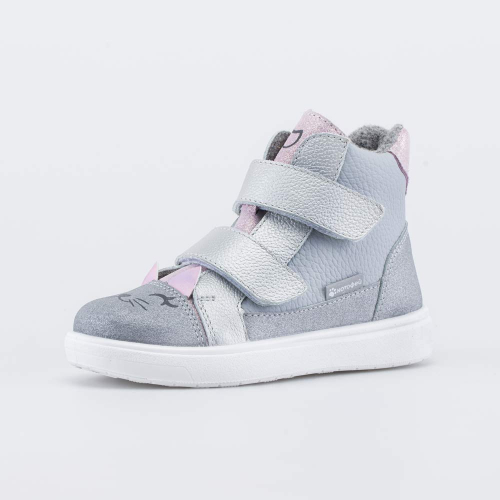 Верх серебристых ботинок изготовлен из гипоаллергенной и дышащей натуральной кожи и украшен принтом в виде мордочки котенка с объемными ушками. По всему периметру вдоль подошвы модель защищена антивандальной накладкой.