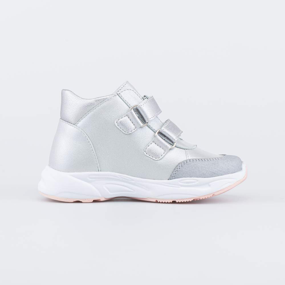 Ботинки для девочки выполнены в нежном серебристом цвете.