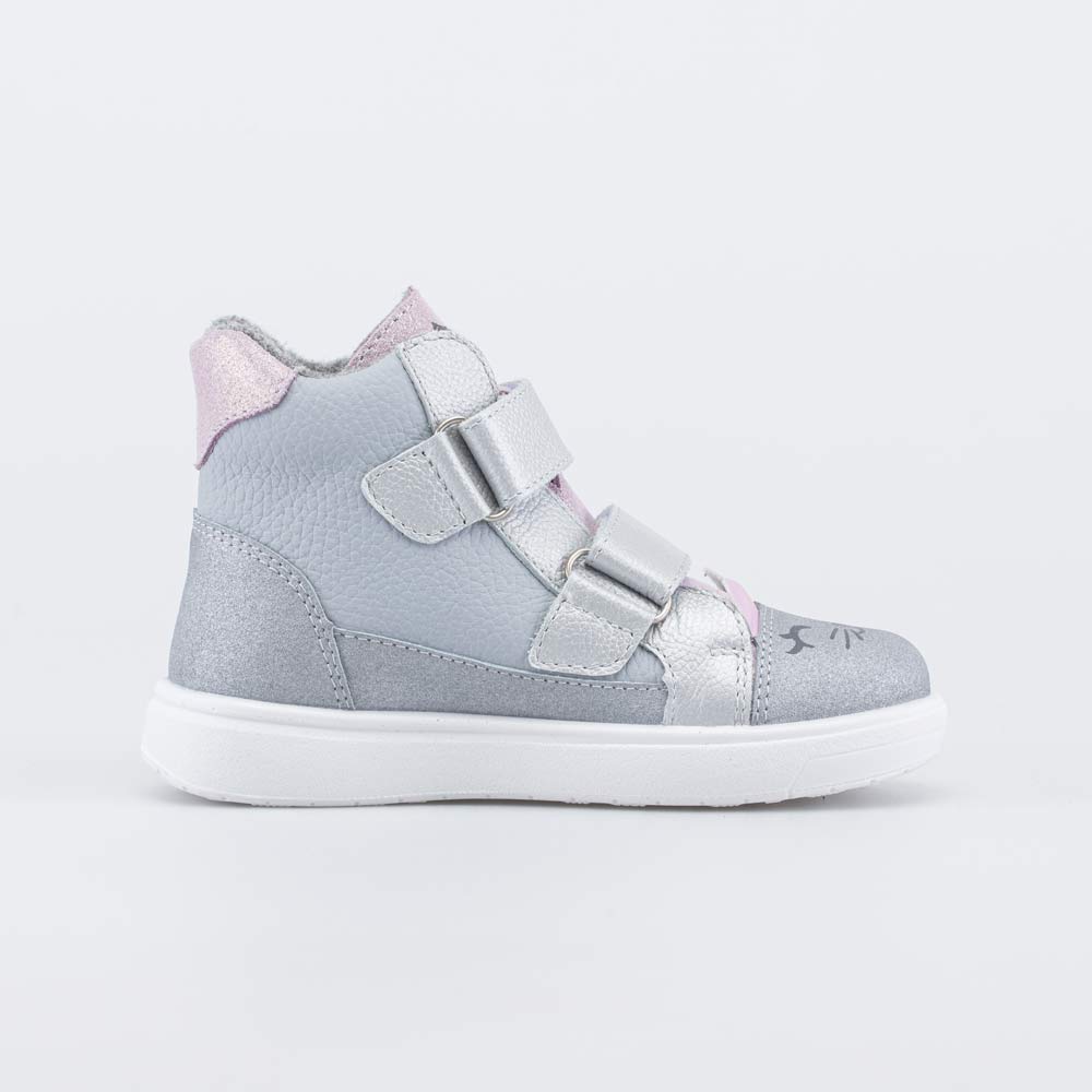 Верх серебристых ботинок изготовлен из натуральной кожи и украшен принтом в виде мордочки котенка с объемными ушками. По всему периметру вдоль подошвы модель защищена антивандальной накладкой.