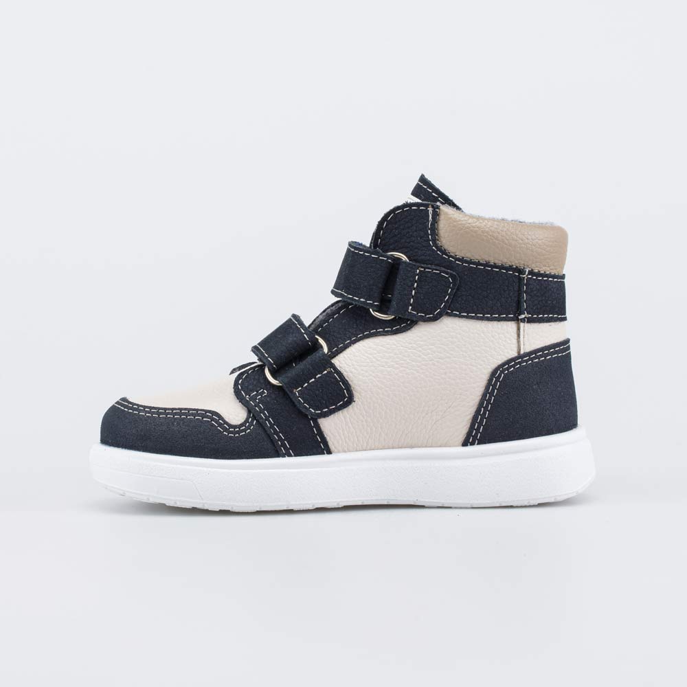 Верх детских ботинок из натуральной кожи выполнен в тренде колорблок, который заключается в гармоничном сочетании цветов. Носок и пятка защищены антивандальными накладками.