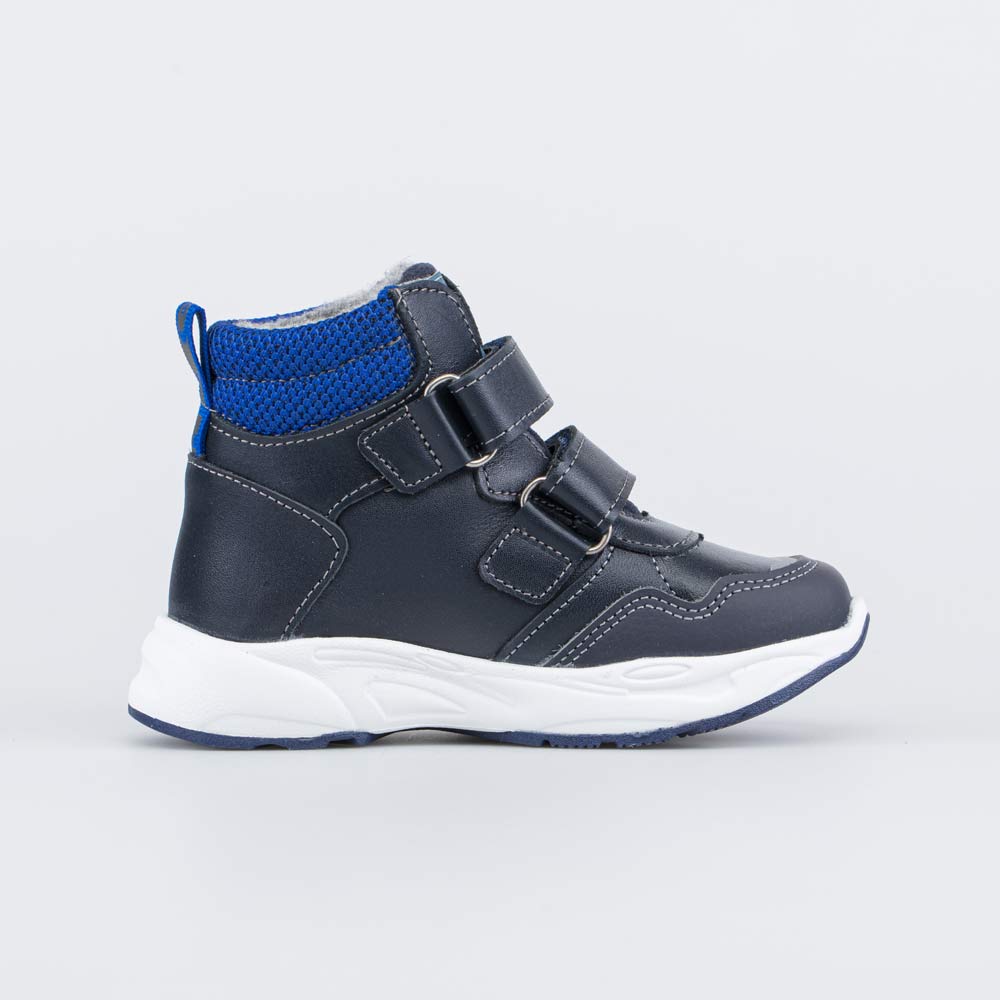 Утепленные ботинки синего цвета, выполненные в кроссовочном стиле, подходят для мальчика-дошкольника.