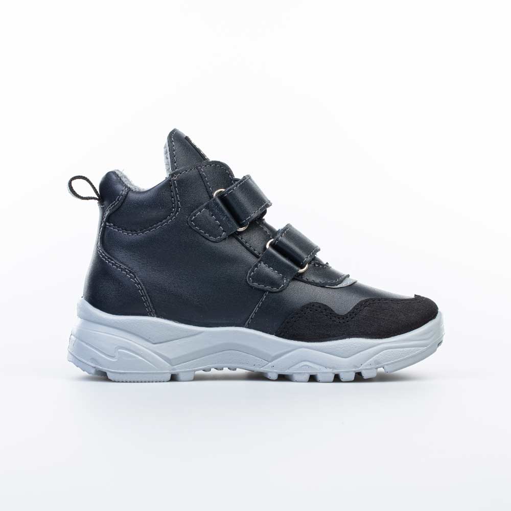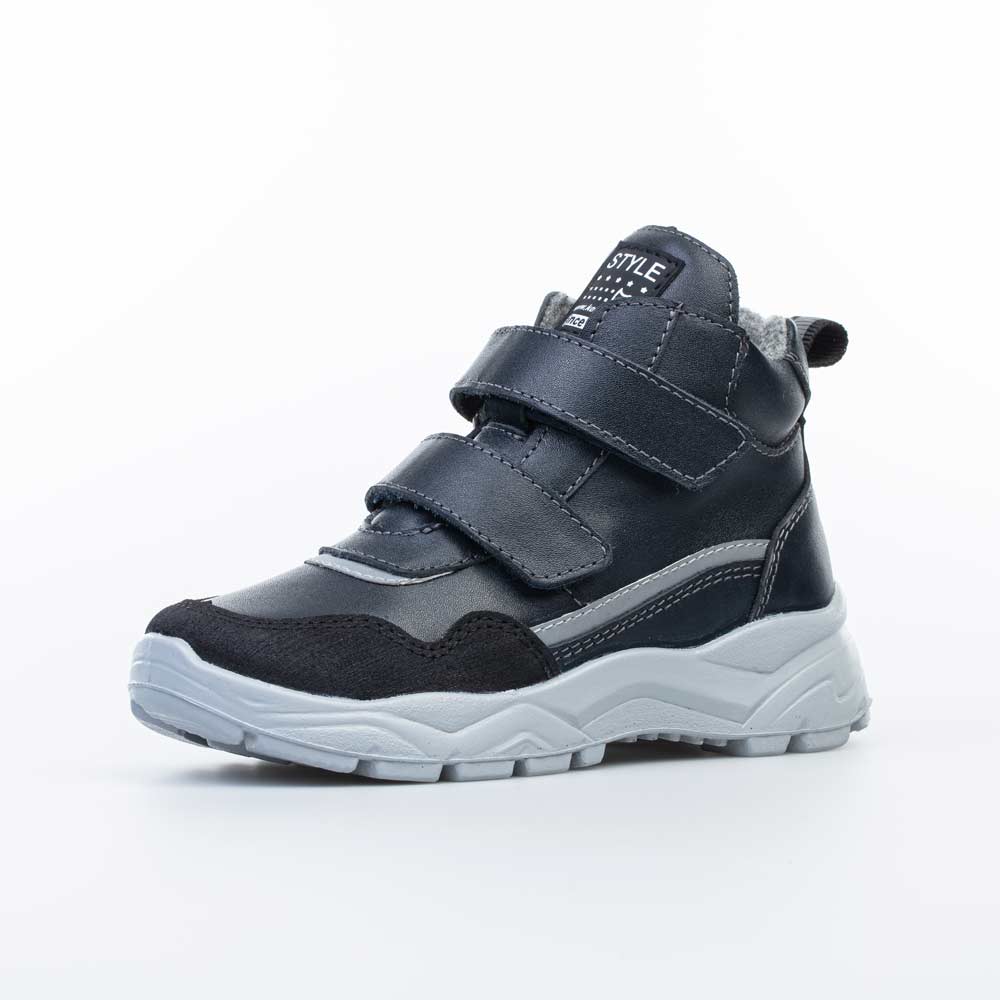 Верх этих темно-синих ботинок изготовлен из гипоаллергенной и дышащей натуральной кожи. Носочная часть защищена от реагентов и повреждений антивандальной накладкой с ПУ-напылением. Светоотражающие детали повышают безопасность ребенка в темноте.