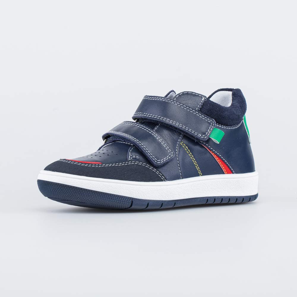 Демисезонные ботинки для мальчика выполнены в синем цвете и декорированы цветными элементами.