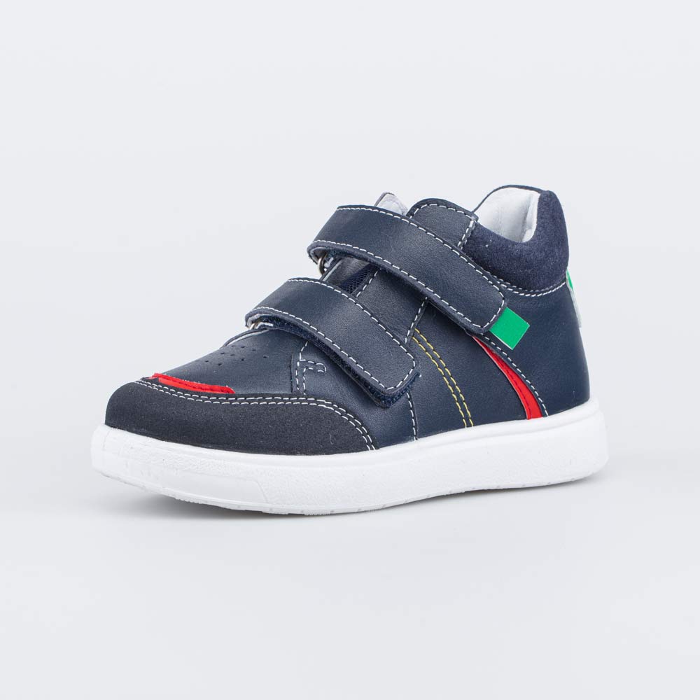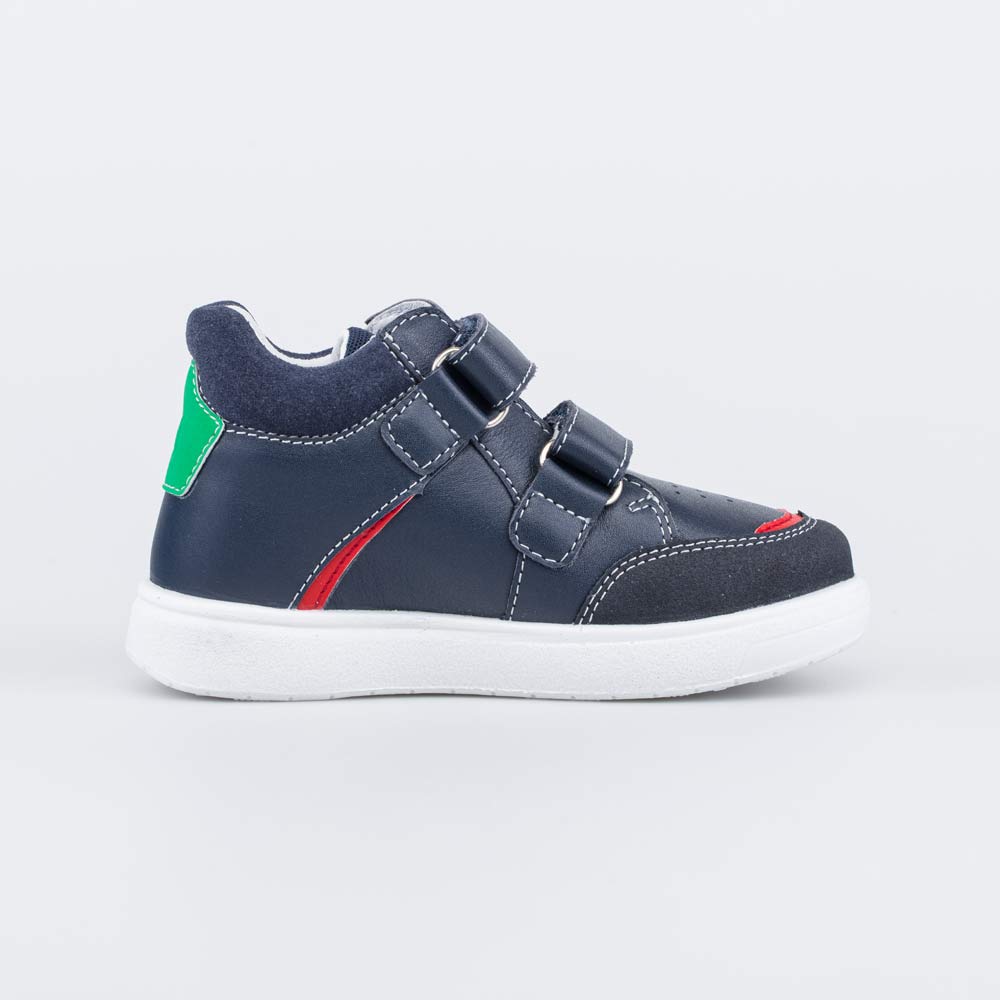 Кожаные ботинки для мальчика выполнены в синем цвете с яркими акцентами красного и зеленого.