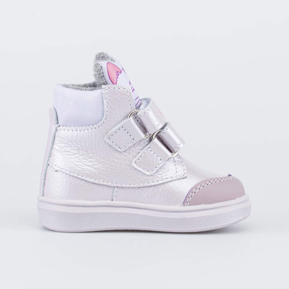 Верх выполнен из натуральной кожи нежно-сиреневого цвета. Подкладка из шерстяной байки и войлочная стелька удерживают тепло и обеспечивают здоровый микроклимат вокруг ножки.