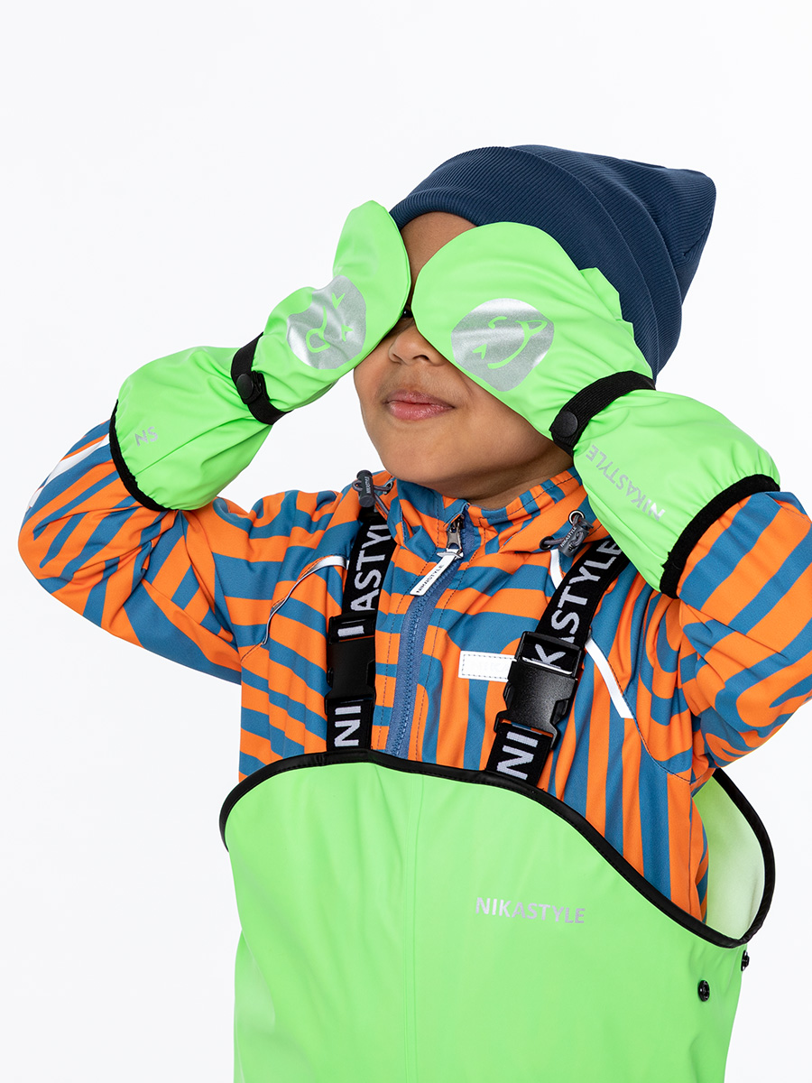 Непромокаемая варежки NO RAIN с проклеенными водонепроницаемыми швами . На трикотажной подкладке. Прорезиненной материал ткани на хлопковой основе обладает эластичностью, упругостью и прочностью, его смесь с хлопком придает большую мягкость ткани. Водонепроницаемый, легкий, прочный материал, обеспечивает сухость, чистоту и комфорт для ребенка. Незаменимая вещь для практичных родителей и их непоседливых малышей. Возможно использование с поддеванием во внутрь вязанных варежек, для более низких температур.